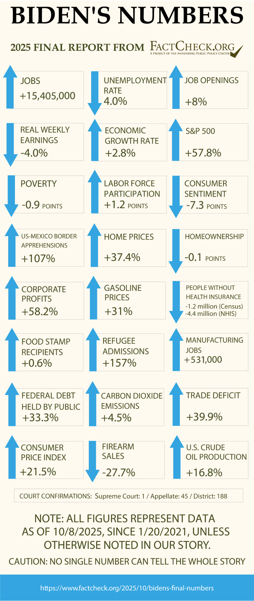 We’ve been publishing quarterly “numbers” articles about how the country has fared under the president since Barack Obama’s second term. We last posted an update for President Joe Biden in October 2024, weeks before Election Day, and a look at what President Donald Trump inherited on Jan. 20. But it takes some time for many of the final figures to be gathered, revised and released. We’re nearly at that point now.