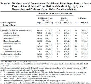 When Kulldorff asked about the imbalance during the meeting, a Pfizer scientist, Dr. Alejandra Gurtman, disputed that there was a “fourfold rise” and pointed to other numbers for congenital abnormalities — “about 5%” in the vaccinated group versus 3% in the placebo group. She also said that the rates seen in the trial were not higher than the expected background rate, and that most of the birth defects were first trimester defects. There was then a lengthy exchange over what the correct numbers were.