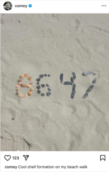 In May 2025, while walking on the beach in North Carolina, Comey said he came across shells arranged to spell out “86 47” — Donald Trump is the 47th president — and he shared the image on Instagram.
