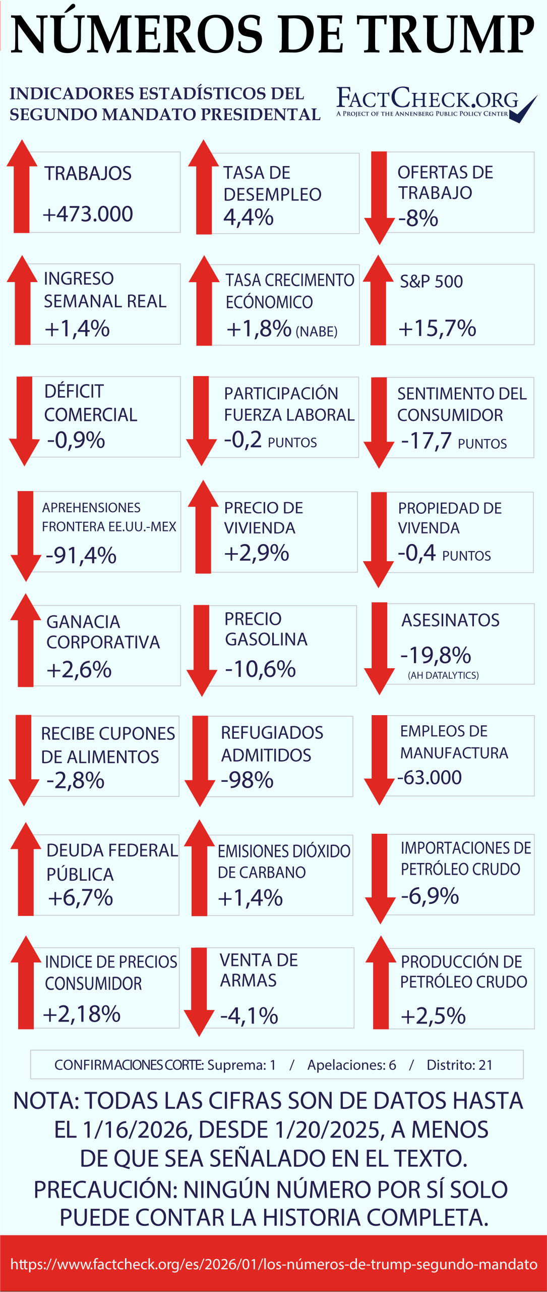 En un discurso del 13 de enero, el propio Trump citó “los números” para su historial económico, haciendo un uso acertado, aunque incorrecto, de superlativos. “Según casi todos los parámetros, hemos pasado rápidamente de los peores números registrados a los mejores y más sólidos”, dijo. “Solo basándonos en los números”.